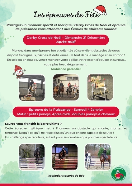 Pour des inscriptions en stages lors des vacances, ou pour des renseignements et inscriptions aux concours veuillez envoyer un mail à lesecuriesdechateaugalland@orange.fr